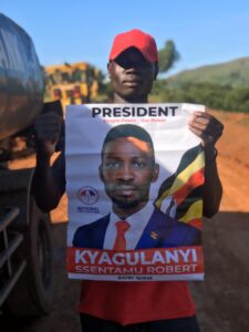 Some were holding and showing off Bobi Wine’s portrait to Museveni’s fleet of cars.