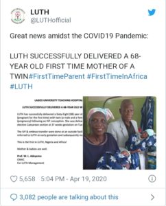 LUTH stated she delivered through an elective cesarean section at 37 weeks on Tuesday, April 14, 2020. “The IVF and embryo transfer were done at an outside facility. She was thereafter referred to LUTH at early gestation and subsequently managed till term. This is the first in LUTH, Nigeria, and Africa! Mother and babies are doing well,” the hospital said.
