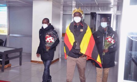 Royal treatment for Cheptegei on return to Uganda Joshua Cheptegei (centre) with teammates Victor Kiplagat and Stephen Kissa at Entebbe Airport upon...