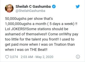 – NTV Uganda presenter Sheillah Gashumba said some production managers were offerin g about 50,000 per show – The journalist further noted she was famous but it was pointless in being known by the whole world when she earned peanuts – The 24-year-old joined media at the age of eight and was first employed by WBS TV where she hosted a couple of kids shows Former NTV Uganda presenter Sheillah Gashumba has lifted a lid on the frustrations and financial struggles her colleagues in the industry go through.