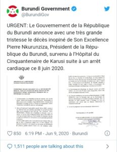 In a statement, the government of Burundi said Nkurunziza died on Monday, June 8, from cardiac arrest at Karusi Fiftieth Anniversary Hospital. “The Government of the Republic of Burundi announces with great sadness the unexpected death of His Excellency Pierre Nkurunziza, President of the Republic of Burundi, at the Karusi Fiftieth Anniversary Hospital following a cardiac arrest on Monday, June 8, 2020,” the statement read.