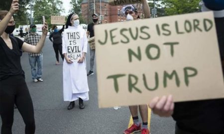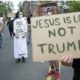 A woman religious and protesters in Washington gather near the Capuchin College June 2 as President Donald Trump and first lady Melania...