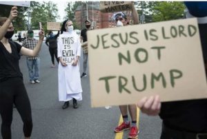 Catholic activists, nuns, laypeople and local residents protested in front of St. John Paul II National Shrine in Washington during President Donald Trump’s visit there June 2.