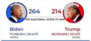 Democratic presidential candidate Joe Biden has 264 electoral college votes, according to an update by the Associated Press. 270 electoral votes are needed to win the presidency. #Elections2020