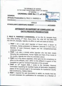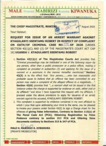 He goes ahead and requests for the issuance of Warrant of Arrest of Kyagulanyi from the Wakiso Magistrates Court on 5 cases that come from Giving false information, Uttering False documents and Obtaining nomination by false pretense.