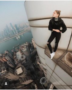 She is always looking for new challenges and adventures, and while she is at it – she doesn’t forget to take aselfie or ask someone to photograph her.from standing on the edge of a skyscraper to laying down on the edge of a high rising building’s rooftop.all of her pictures are both beautiful and cringe – worthy at the same time.