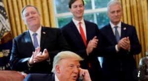 Secretary of State Mike Pompeo and White House senior adviser Jared Kushner applaud as US President Donald Trump is seen on the phone with leaders of Israel and Sudan on October 23,