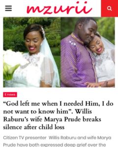 – Willis Raburu and Marya Prude are reported to be living miles apart after break up that has lasted almost a month – The news anchor is reported to have cheated on his wife with another lady – Marya had deleted her Instagram account weeks earlier leading to fans speculating on their relationship Citizen TV’s news anchor Willis Raburu and wife Marya Prude are reportedly separated months after losing their infant daughter. The two are believed to have broken up over a month ago and living miles apart from each other.